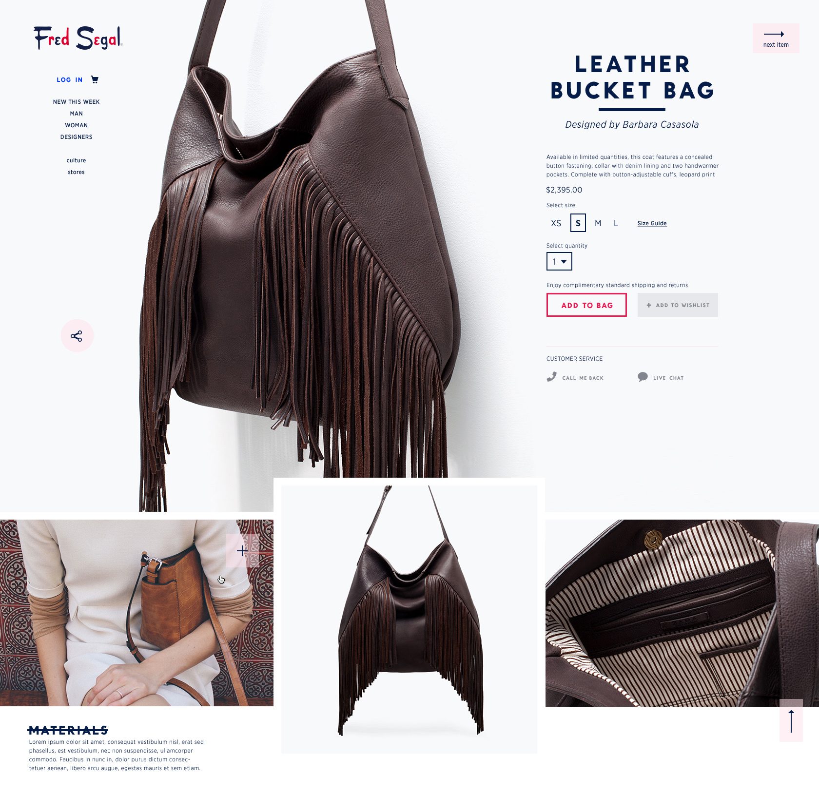 This page is dedicated to the item—its details, its story, and the designer behind it. The goal is to make you feel the essence of the piece and appreciate its effortlessly understated cool.